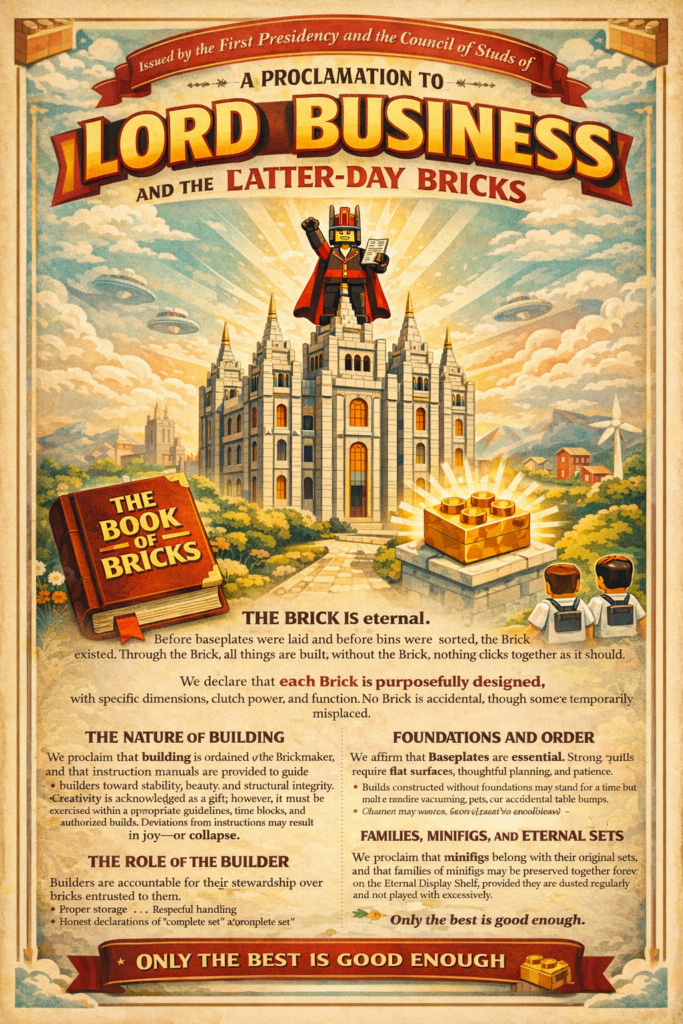 We, the leaders of The Church of Lord Business and the Latter-Day Bricks, solemnly proclaim that the Brick is central to the plan of Order, and that all meaningful builds are established upon correct tolerances, firm foundations, and proper alignment.