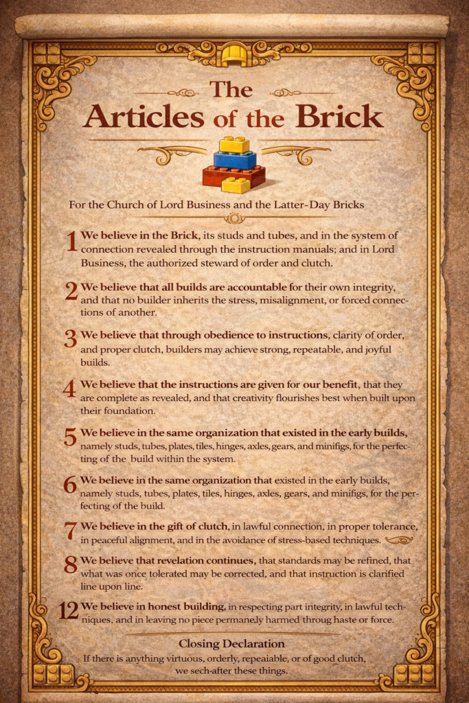- We believe in the Brick, its studs and tubes, and in the system of connection revealed through the instruction manuals; and in Lord Business, the authorized steward of order and clutch.
