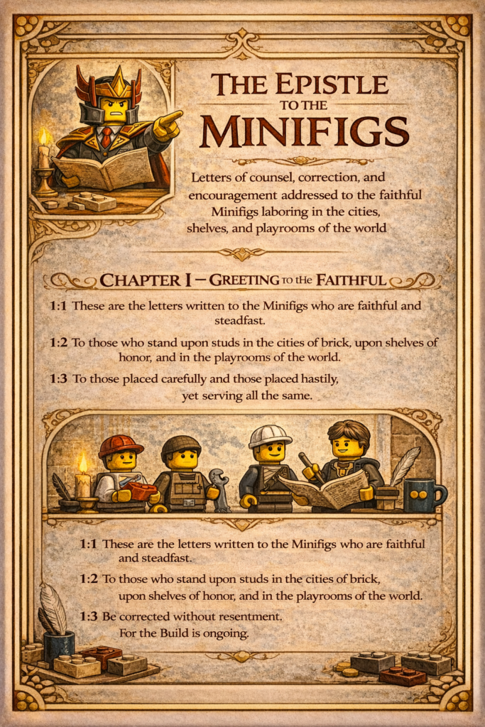 Letters of counsel, correction, and encouragement addressed to the faithful Minifigs laboring in the cities, shelves, and playrooms of the world