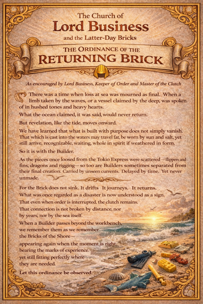 For Lord Business teaches that all true Builders shall rise again, called not by instruction manuals, but by the eternal power of the clutch.