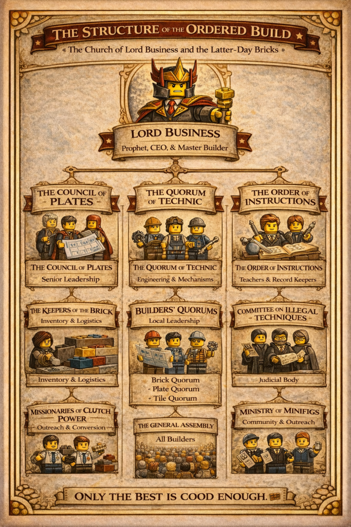 As the Church of Lord Business and the Latter-Day Bricks increased in number, it became necessary that the work be done decently, in order, and according to clutch power. Therefore, offices were established, stewardships assigned, and authority delegated, that the builders might labor without confusion and the bins remain undefiled.